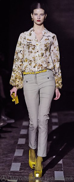 Smarte Looks, die sich besonders für gehobenen Bürochic eignen, deren Strenge aber durch die Printblusen und -kleider gelockert wurde, waren zu bewundern. Ein Highlight war definitiv das braune Kleid mit der großen Schleife in Etuiform und das Pendant dazu als Bluse. Die Kleidung verkörperte perfekt das Geschick, das üblicherweise Angehörige des Geldadels, besitzen: kostbare Kleidung so zu tragen als wäre sie das Nebensächlichste der Welt. Obwohl die Outfits auf Understatement setzten, wurde nie das Besondere vergessen: Knotungen, Schleifen, Drapierungen, und ein sanfter Fall der Seidenkleider garantierten stets kleine, aber feine Hingucker.